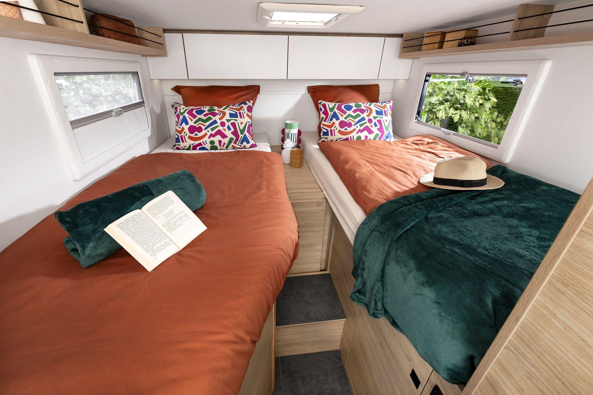 met 2 tweepersoonsbedden (van 1,40m op 1,90m). De stahoogte is 1,98m. Met de skyview en ramen aan de zijkant bieden deze campers toch het ruimtegevoel en contact met de natuur.