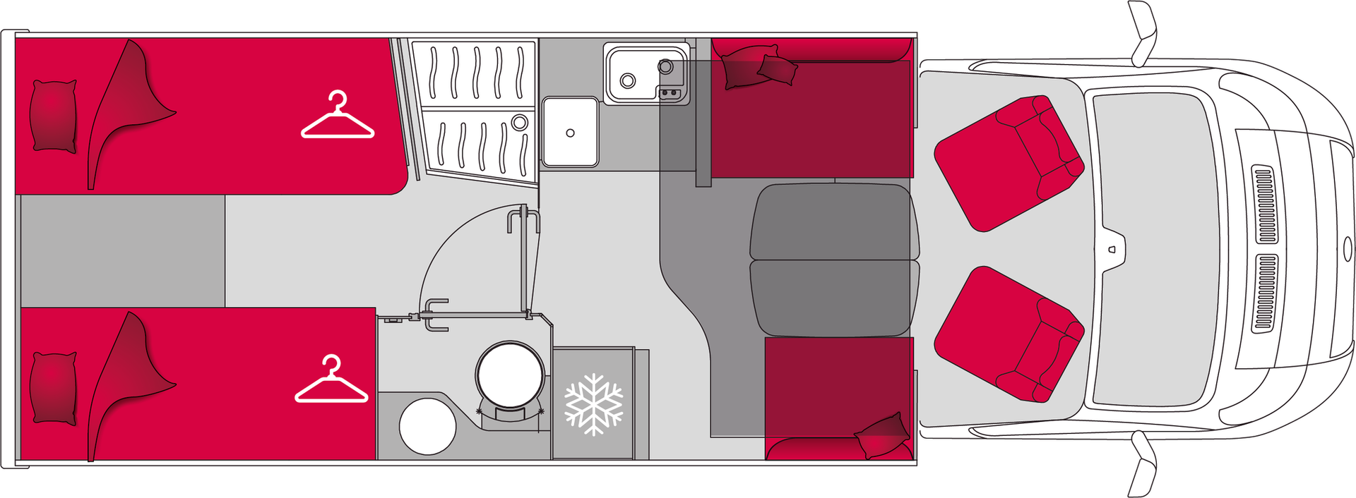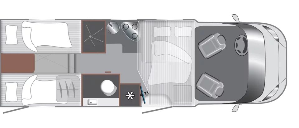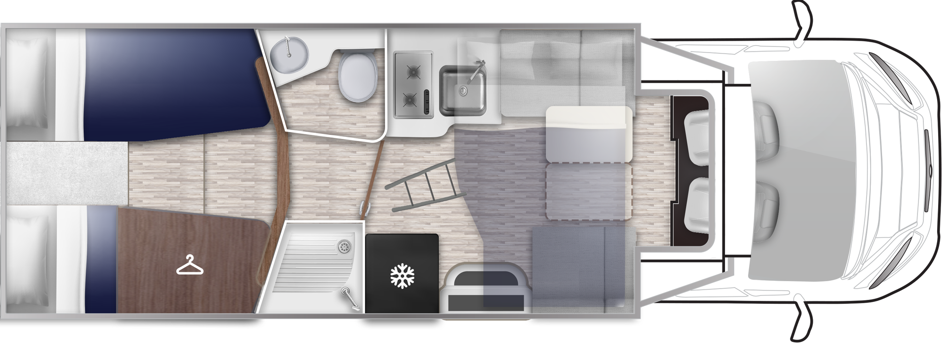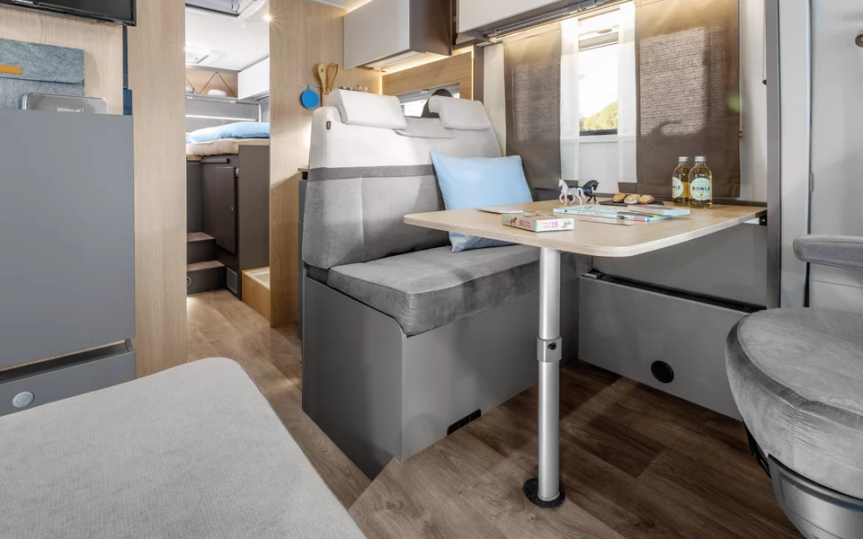 De centrale badkamer creëert een natuurlijke scheiding tussen leef- en slaapgedeelte, wat het woongevoel versterkt. Met zijn lichte interieur en verzorgde afwerking biedt deze 797 een comfortabele, evenwichtige reiservaring voor wie waarde hecht aan ruimte, sfeer en gebruiksgemak.