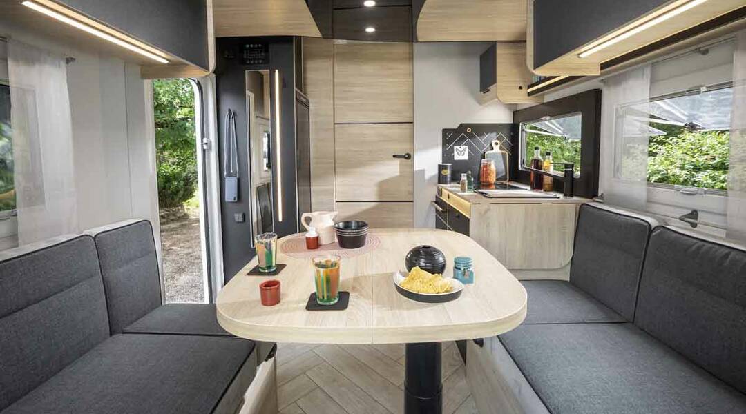 De Chausson 797 Titanium Line is ontworpen voor wie houdt van ruimtelijk comfort en een ontspannen reisritme. De royale face-to-face zithoek vormt het hart van de motorhome en nodigt uit tot lange avonden onderweg, terwijl de twinbedden achterin zorgen voor rust en privacy na een actieve dag.
